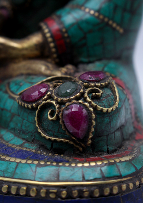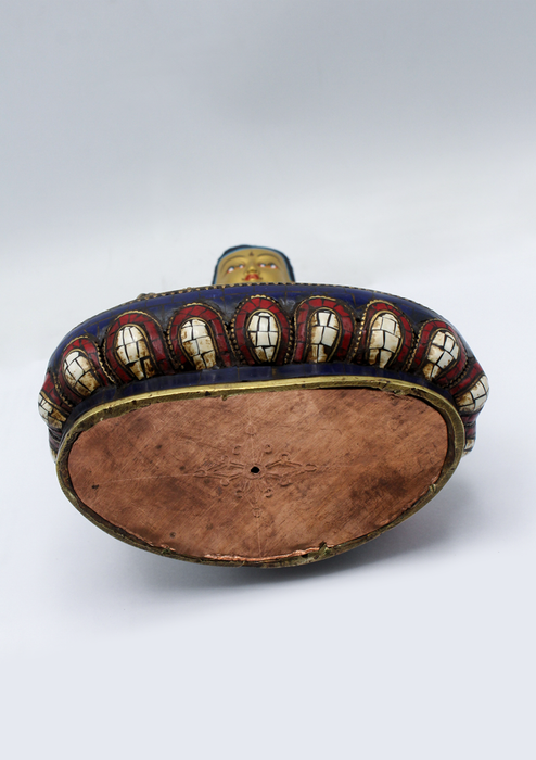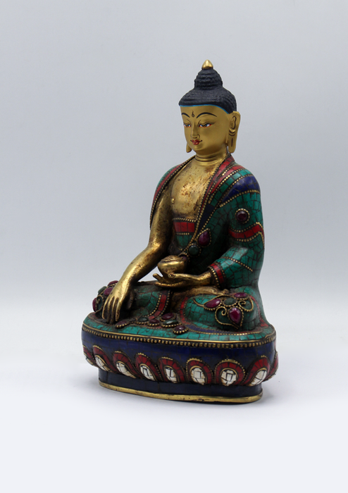 Crafted from durable copper and adorned with vibrant stone inlays, it beautifully represents enlightenment, wisdom, and compassion. The intricate detailing captures the Buddha in a serene meditative posture, radiating spiritual balance and tranquility. The colorful stone inlays add a touch of elegance, symbolizing the harmony of natural elements and the richness of Buddhist traditions.