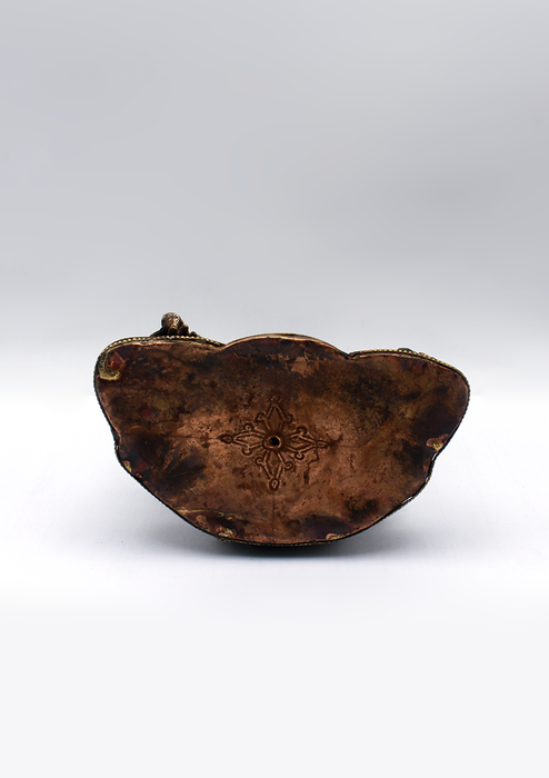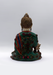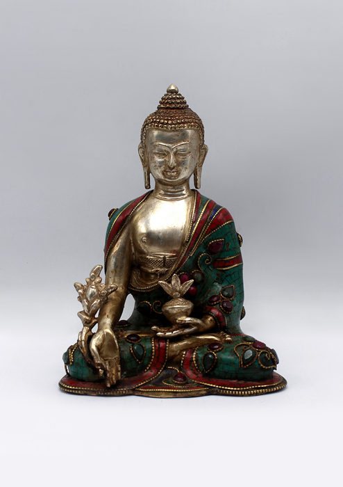 This captivating statue of the Medicine Buddha, also known as Bhaisajyaguru, is richly adorned with intricate stone inlay in deep turquoise and red tones, creating a vivid contrast against the bronze finish. Seated in the lotus posture atop a lotus pedestal, the Buddha holds a bowl of healing nectar in his left hand, resting in his lap, while his right hand extends downward in the gesture of generosity (varada mudra), holding the myrobalan plant-a sacred symbol of medicine and longevity in Buddhist tradition.