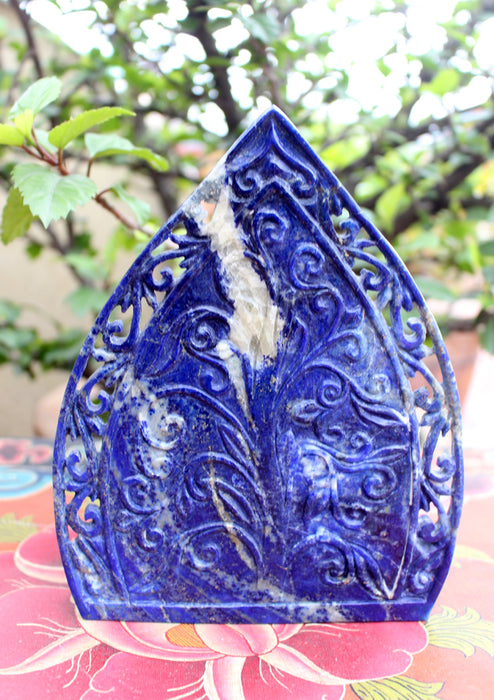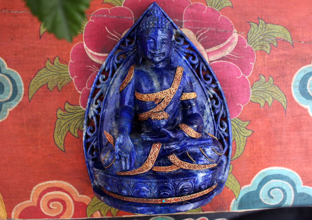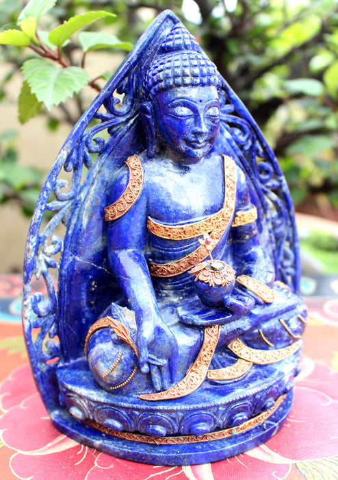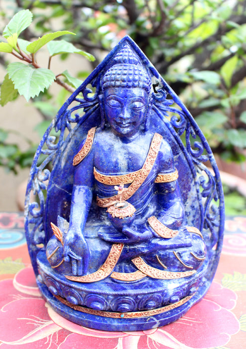 This is a very wonderfully carved Healing Buddha statue handmade in Nepal. The stunning lapis stone makes the statue looks peaceful. The robe of medicine Buddha is decorated with beautifully carved gold plated silver frame. Lapis Lazuli is believed to quickly releases stress, bringing deep peace and brings harmony and deep inner self-knowledge.
