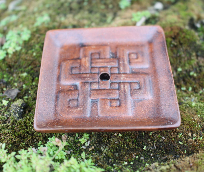 This is a square Terracotta Endless Knot Incense Burner which has one hole at the center. This clay incense holder is completely handmade in a traditional pottery technique in Kathmandu Valley.