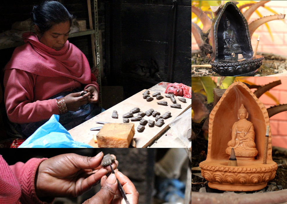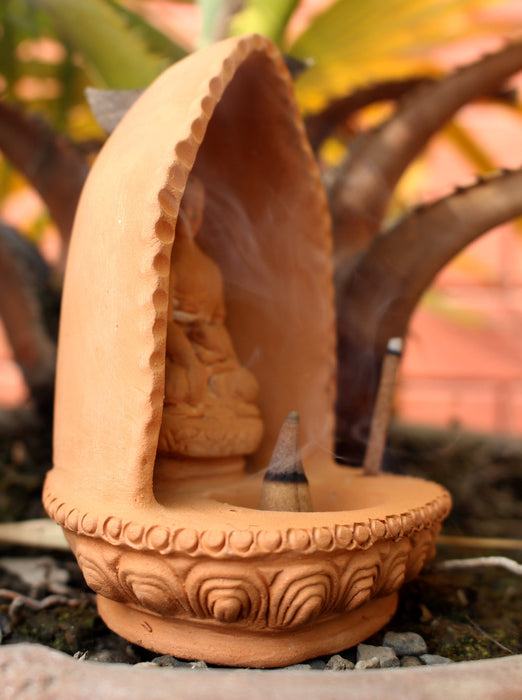 This clay Buddha Incense burner features Shakya Muni Buddha seating on Lotus Asana, deeply meditating inside a cave. The incense burner has two holes for two different sized incense sticks and a hollow pressed surface for burning the cone incense. The idea of this incense burner is foremost to show our love, devotion and commitment towards his Buddha teachings.