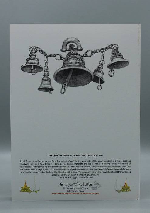 This card depicts devotees gathering around the chariot of Rato Machhindranath to worship the lord during Rato Machhindranath Festival, the biggest annual festival of Patan. Rato Machhindranath is also considered as the Tantric edition of Avalokitesvara in Buddhism and the incarnation of Lord Shiva, who can bring rain in Hinduism.