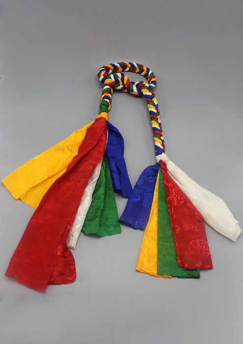 The colorful knotted hanging is used in Tibetan monastery at the door in the entrance. These hanging has the same five colors i.e. red, yellow, white, blue and green as in prayer flags. Blue represents the sky, white represents the air, red symbolizes fire, green symbolizes water, and yellow symbolizes earth. All five colors together signify balance.
