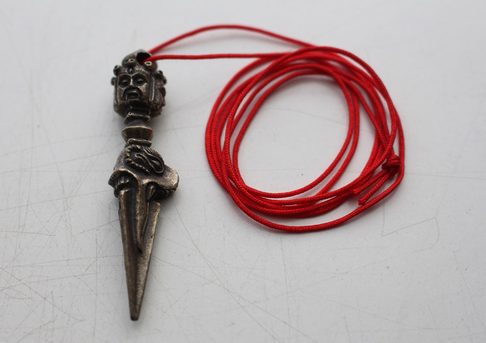 This is a handmade three face Tibetan Buddhist Ritual item Phurba pendant from Nepal. This pendant is beautifully carved with giving each details perfectly. This pendant is made from bronze.