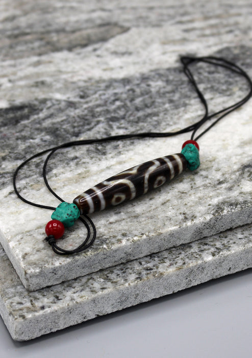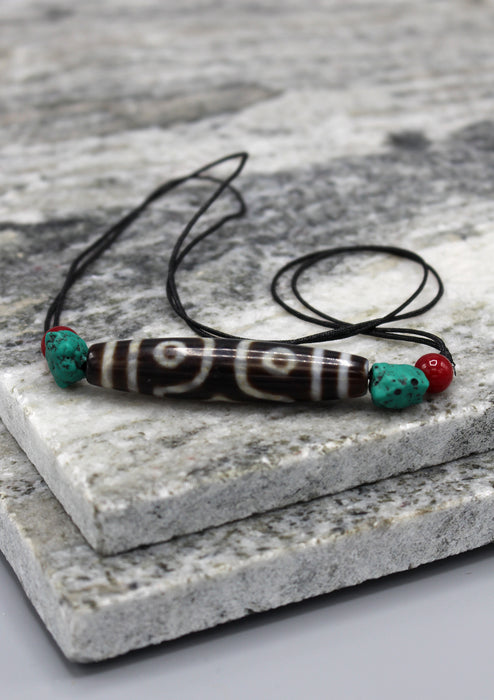 This is a beautiful Tibetan Dzi bead with three eyes. It is barrel shaped. The hole is pierced through the length. It can be worn as a pendant or can be beaded into a bracelet. This beads has two turquoise and coral in both end side of the pendant.
