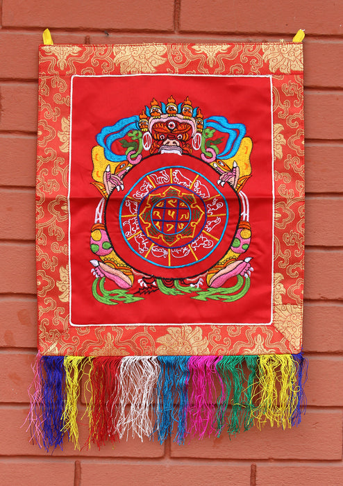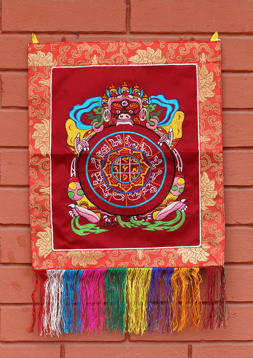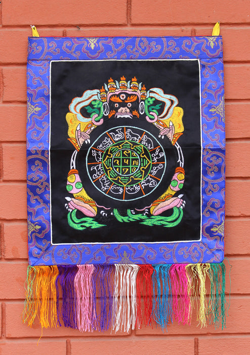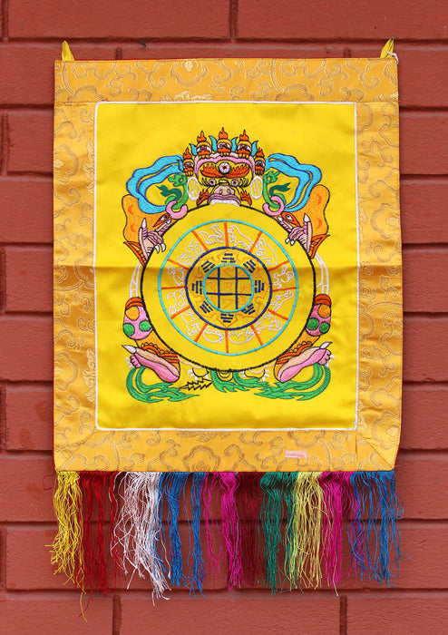 This is a brocade framed polyester Wall hanging banner from Nepal. This banner is embroidered with Tibetan astrology calendar. The wall hanging has colorful tassel of 4"