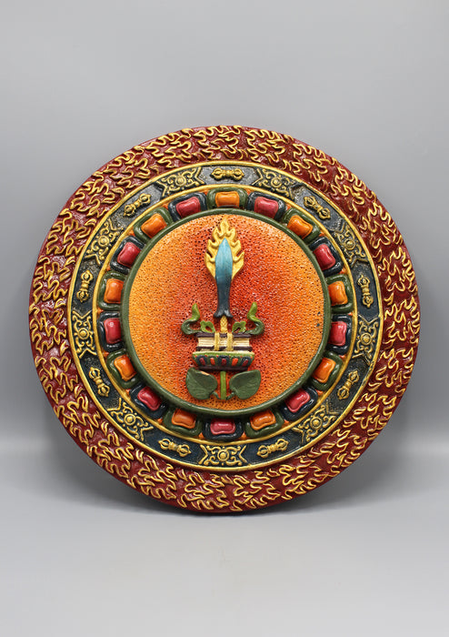 This wall hanging is has been amazingly carved giving each details perfectly. The border of the wall hanging has been carved with beautiful flowers, Dorjee, lotus petals and painted with Red, Green, Orange and Golden color. The outer border of the wall hanging is carved as a flame in golden color.