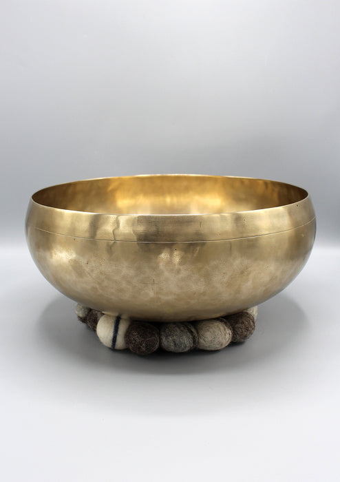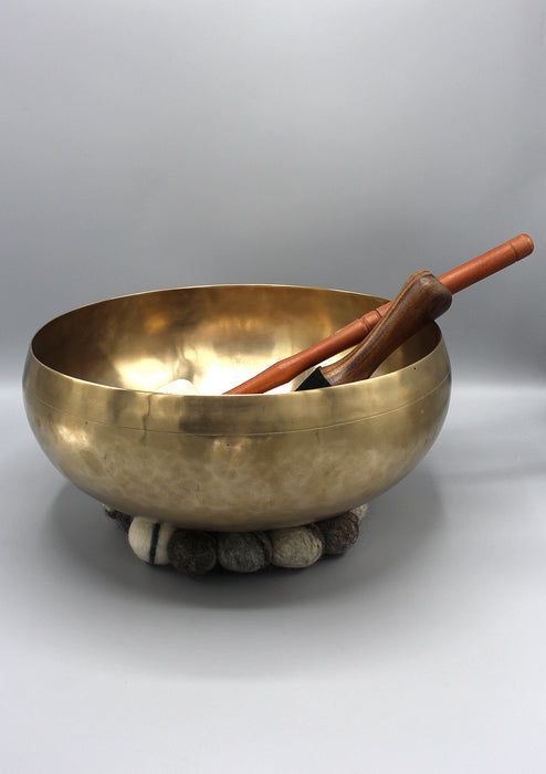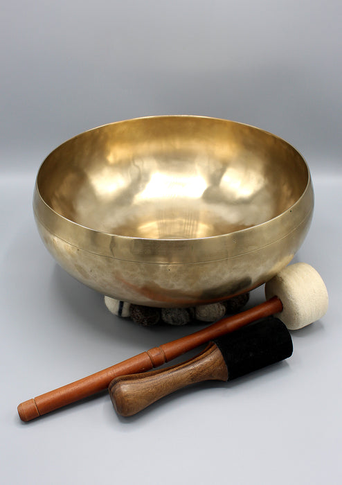 This is a large fine plain hammered singing bowl which has an elongated humming sound. The surface is quite smooth and the set consists of a singing bowl, a cushion, a drum stick and a mallet. The singing bowl is smooth in texture and in sound too. These large bowl is use in healing therapy.