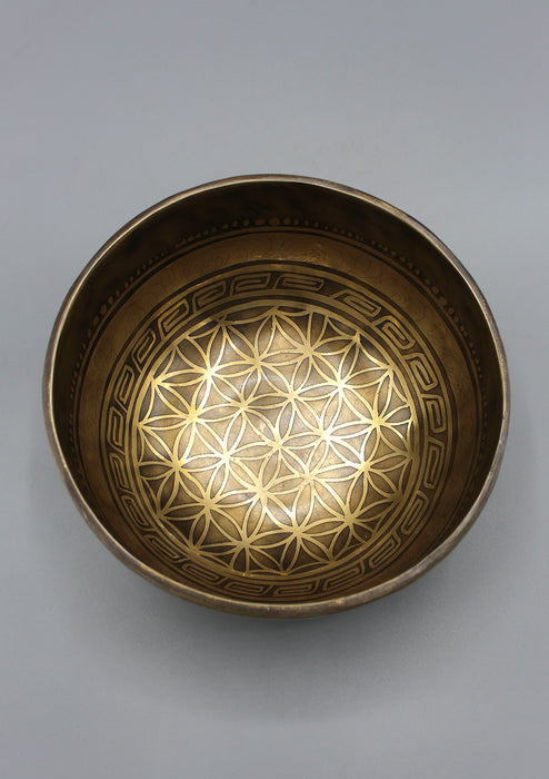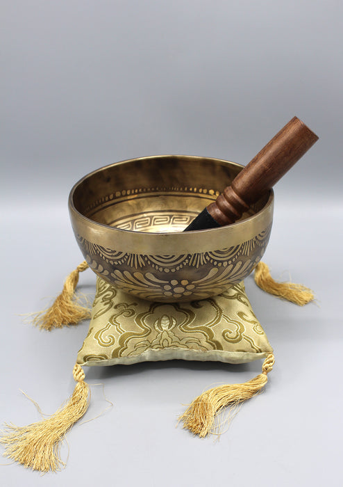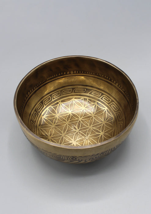 This is a handmade singing bowls that are finely etched with Tibetan Mandala. In this singing bowl there is a fine etching of Tibetan mandala along with Double dorjee in the back and beautiful flowers that encircle the singing bowl.