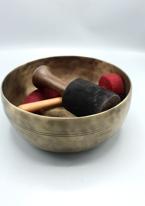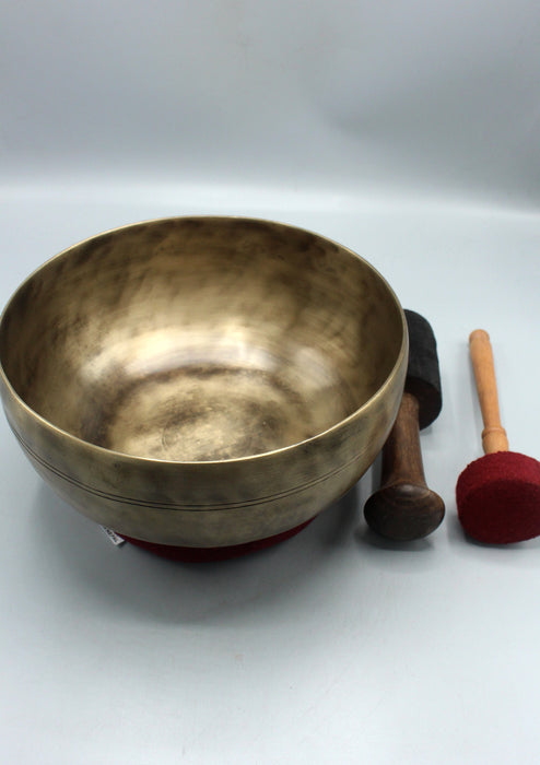 This is a Tibetan Old Healing Glass Shape Singing Bowl with Maroon Ring Cushions, Felt Drum stick and a Mallet.