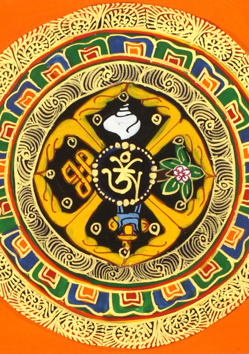 Here, a beautiful Tibetan Om is created in the middle and surrounded by Buddhist Auspicious Symbols.
