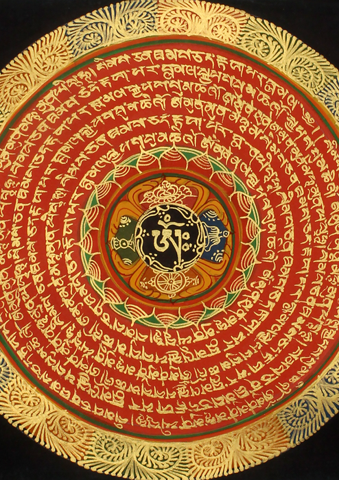 This is a Tibetan Om Auspicious Symbols Thangka Painting. It is hand drawn on primed cotton canvas using mineral and vegetable pigments.