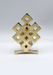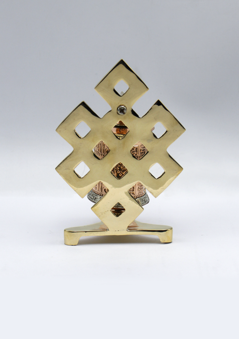 The wheel is mounted on a striking, gold-toned base, adorned with different inlays in the shape of the auspicious Endless Knot, symbolizing eternal harmony.