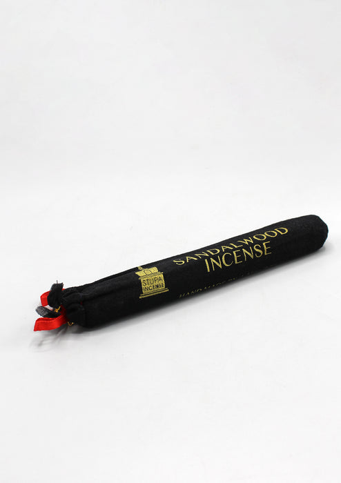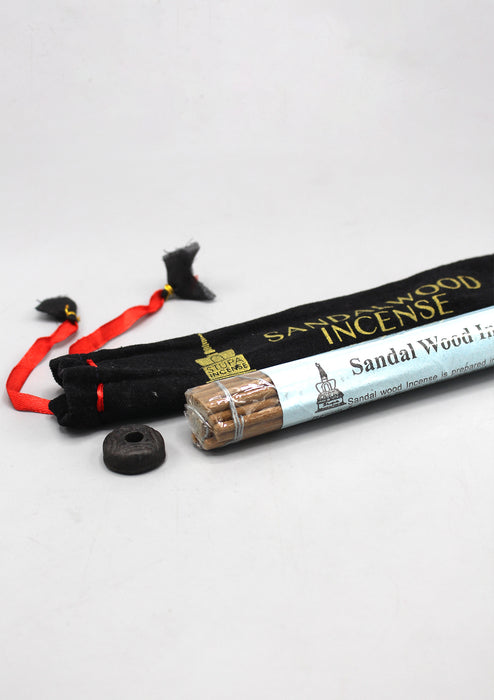 Sandal wood incense is prepared in accordance with vedic recipe and old Buddhist incense making method. In order to create non-stick incense, Himalayan aromatic herbs and tree barks are blended together. This incense has been made by Lama Dorjee. The incense is wrapped in a velvet bag in order to avoid damage. The incense should keep in a dry place free from moisture.
