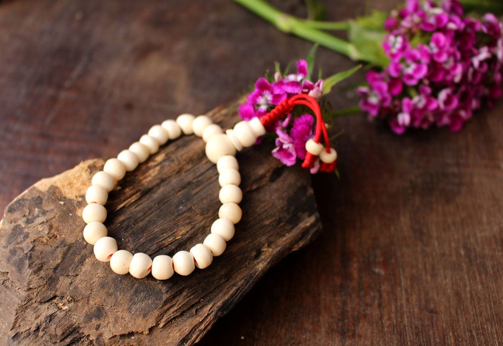 This is a bone bracelet. The bone beads are carved meticulously to formthe round shape and then is strung together in a durable nylon thread. This is a unisex bracelet and is adjustable.