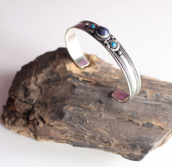 A beautiful light weight Silver plated Traditional Tibetan bracelet with Faux Lapis and Turquoise stones. This bracelet has open ends and can be flexed to adjust further. A very casual bracelet which can go with any apparel.