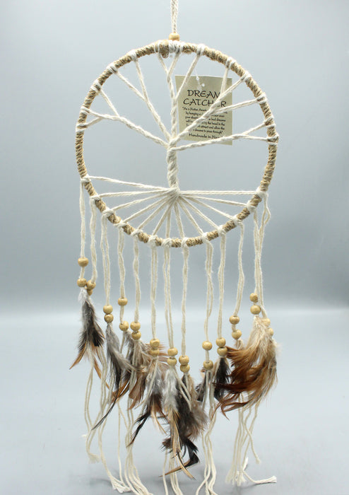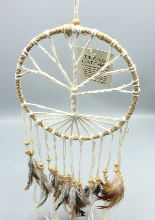 This is the Tree of Life Dream Catchers are hand made in Nepal. It come in sizes of small and large. It is made using a hoop, hemp and cotton mixed fiber, beads and feather. The feathers used in the dream catcher come from a local poultry farm where the feathers are harvested in an humane manner.