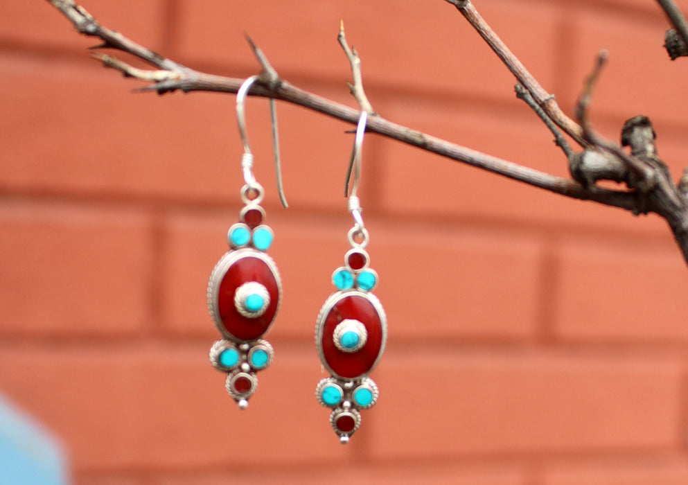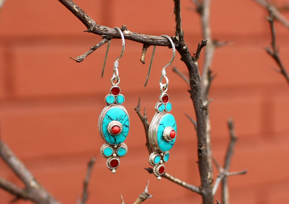 This earrings is made of silver and finely hand carved in Nepal. The silver earrings is beautifully made and presented. The earrings is shaped into a beautiful flower drop design with inlaid turquoise and coral.