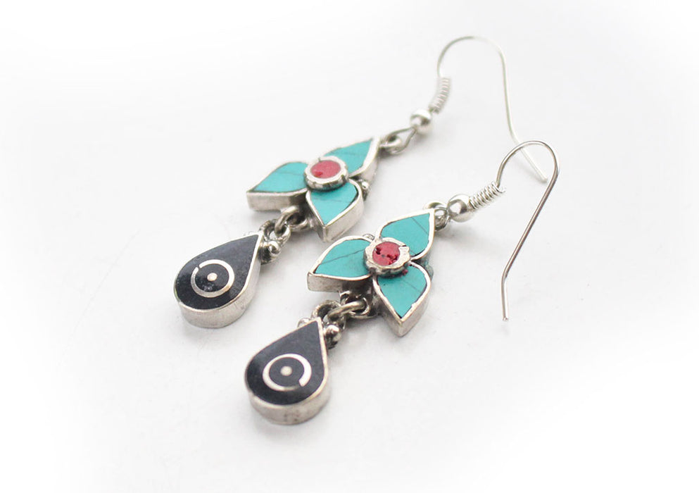 These are the beautifully made white metal earrings. The earrings is handmade and inlaid with resin turquoise and coral. The flower with drop pattern is the most beautiful thing about this earrings.