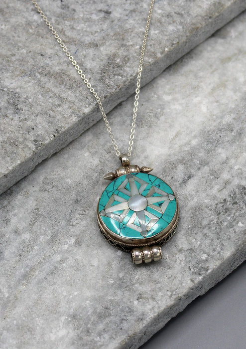 This is a handmade silver sterling Double Dorjee Pendant from Nepal. This Tibetan Ghau Pendant is beautifully made with Turquoise inlaid.