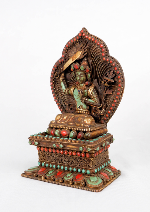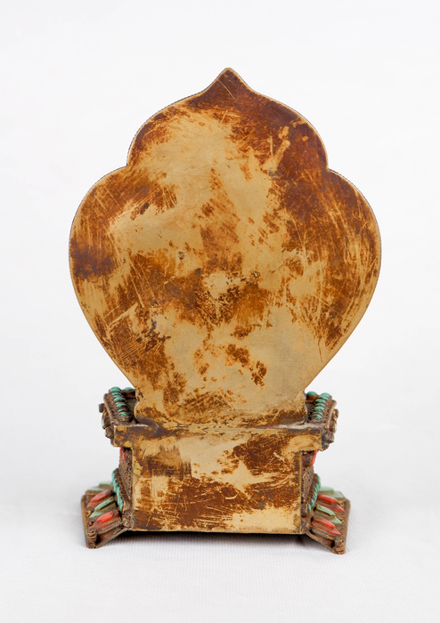 This masterpiece features a copper-gold plated stand and a body adorned with coral, lapis, and turquoise stones. Standing at 17cm with a base breadth of 6cm, it's a harmonious blend of artistry and spiritual essence.