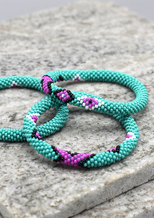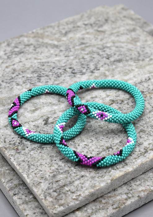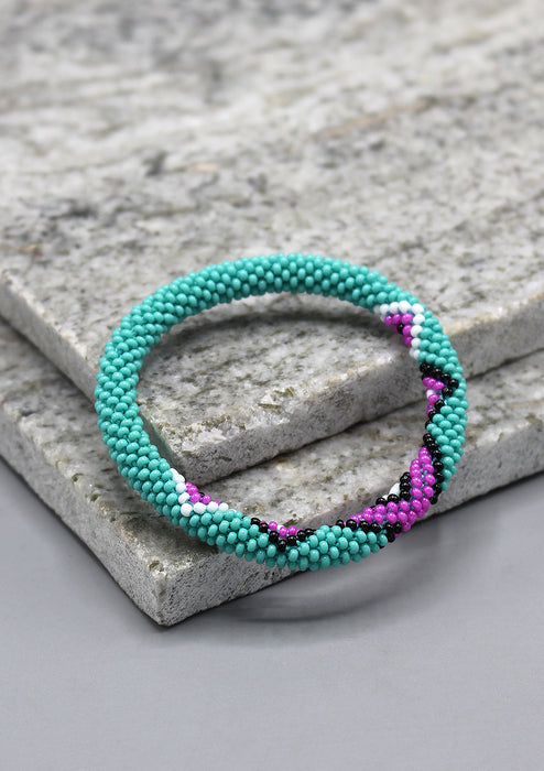 These fairly traded glass beads bracelet are meticulously crocheted by our women artists. Our woman artist carefully hand-strung these Roll On bracelet to give them the best shape and design.