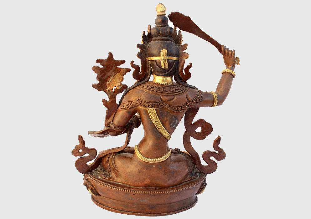 This unique Manjushri statue is made of copper employing the ancient lost wax technique. Partly gold plated with high quality sculpting makes this statue unique and beautiful. The jewels worn by the deity here is heavily gold plated. The carving on the ornaments are very fine and detailed.