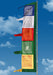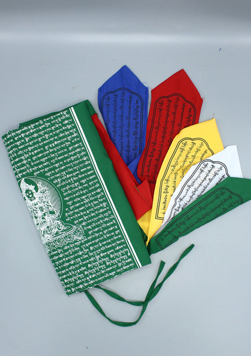 The yellow flag is printed with Tibetan windhorse and its associate mantras. Green flag is printed with Green Tara and her mantras. The Red flag is printed with Amitabh Buddha, Blue flag is printed with healing Medicine Buddha and White flag is printed with Chenrezig, the god of compassion and their associate mantras.