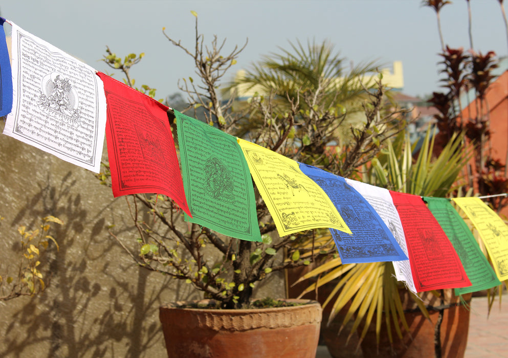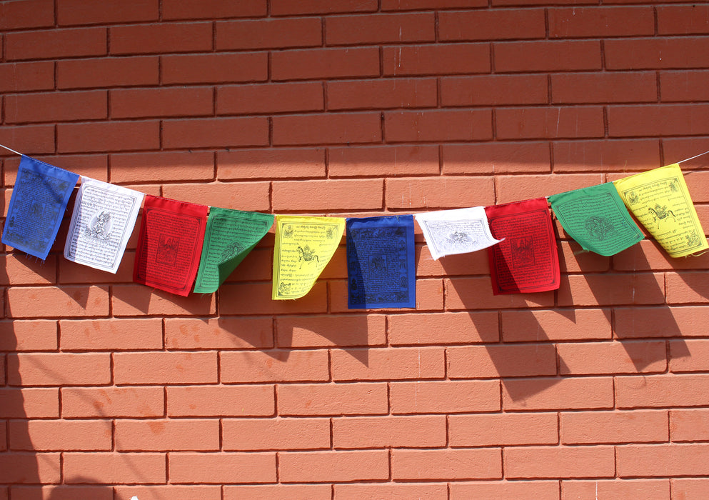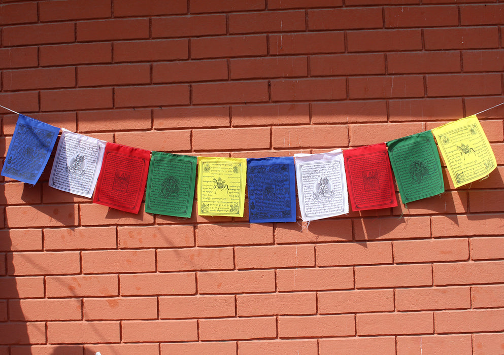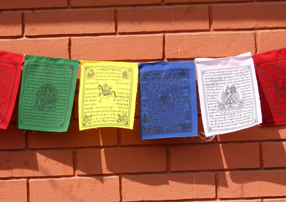 Prayer Flags are auspicious flags that contain images of Dieties, Mantras, and Prayers which is traditionally believed to bring happiness, peace, prosperity, good fortune, health and victory over the obstacles. Prayer Flags are used to promote peace, compassion,strength and wisdom. Prayers inscribed on prayer flags protect from destructive evils and obstacles toward the flag planter and all sentient beings.