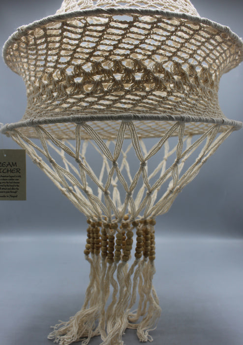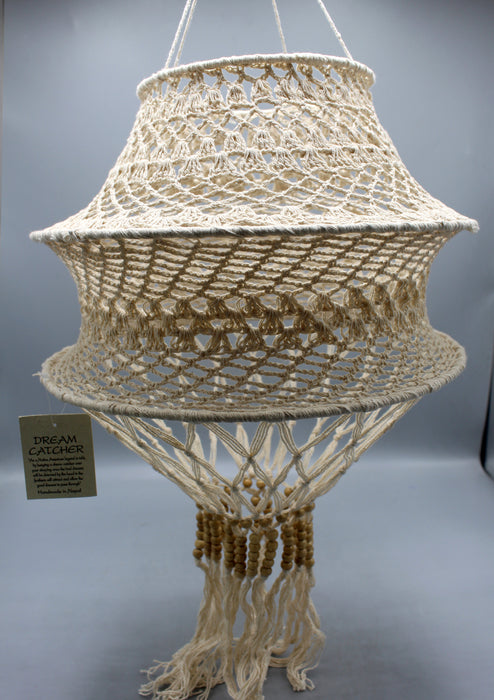 This is a large sized 12 inch dream catcher hand made in Nepal. This comes in a mono colored beads. It is made using 2 hoops, hemp and cotton mixed fiber, mono colored beads. This dream catcher is a 2 storied one with different mandala designs on both hoops.