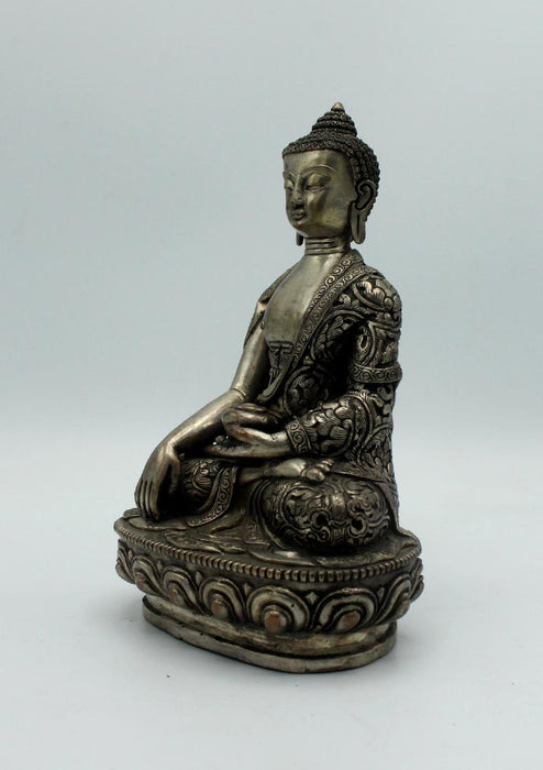 This is a White Metal Shakyamuni Buddha statue handmade in Nepal. The statue has fine floral carvings done on the body of the statue by our master artisans giving it a beautiful visual look.