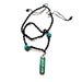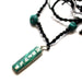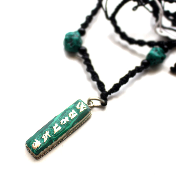 This is a white metal rectangular pendant which has malchite inlays and Om Mani Padme Hum Mantra embossed in the center. Handcrafted in a traditional way in Kathmandu, Nepal, this pendant features a durable woven nylon thread with two turquoise spacers.
