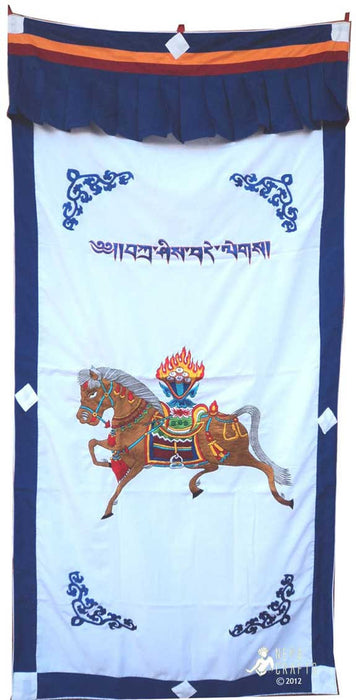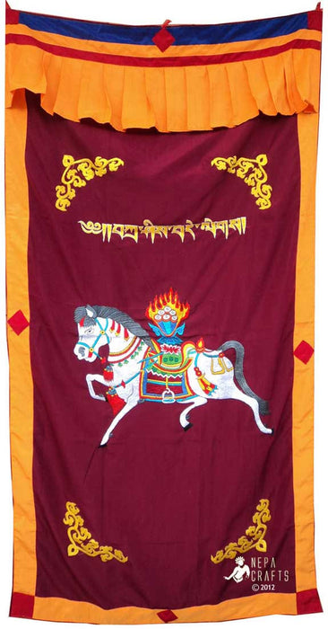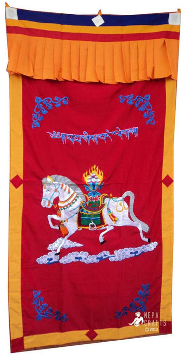 This is a gorgeous heavy silk lined Tibetan Door Curtain. These door curtains are found in many entrances of houses and temples in Nepal and Tibet. It has a Wind Horse Embroidery in the middle and borders at the sides. The Wind Horse is an allegory for the human soul in the shamanistic tradition of East Asia and Central Asia. In Tibetan Buddhism, it was included as the pivotal element in the center of the four animals symbolizing the cardinal directions and a symbol of the idea of well-being or good fortune.