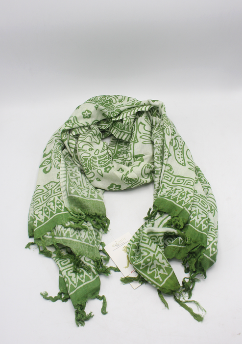 This is a cotton shawl handmade in Nepal using batik technique. The shawl has beautiful pattern printed with Green color and Green and white fringed at the border. Batik is a "resist" process for making designs on fabric. The artist uses wax to prevent dye from penetrating the cloth, leaving "blank" areas in the dyed fabric. The process, wax resist then dye, can be repeated over and over to create complex multicolored designs.