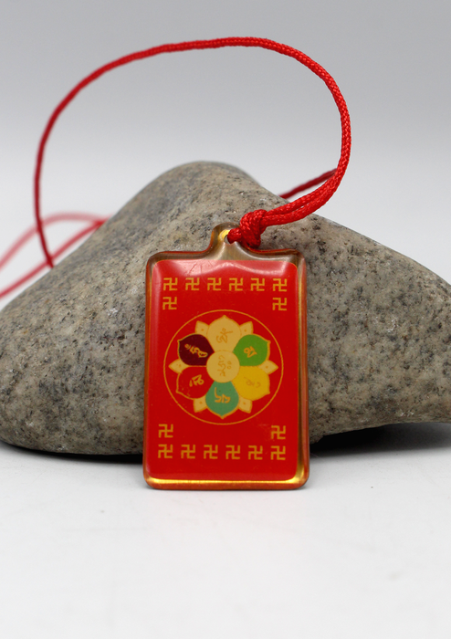 This is a Zambala diety printed locket pendant made in Taiwan. This small pendant has picture of Zambala diety in the front and its associate mantras at the back. This pendant comes with red nylon thread which you can replaced with any kind of small chain you want to wear with.